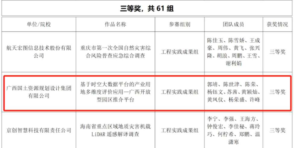 近日,“中国信息协会第四届信息技术服务业应用技能大赛地理信息技术与应用赛项(团体赛)”获奖名单出炉,广西国土规划集团荣获工程实践成果组三等奖。