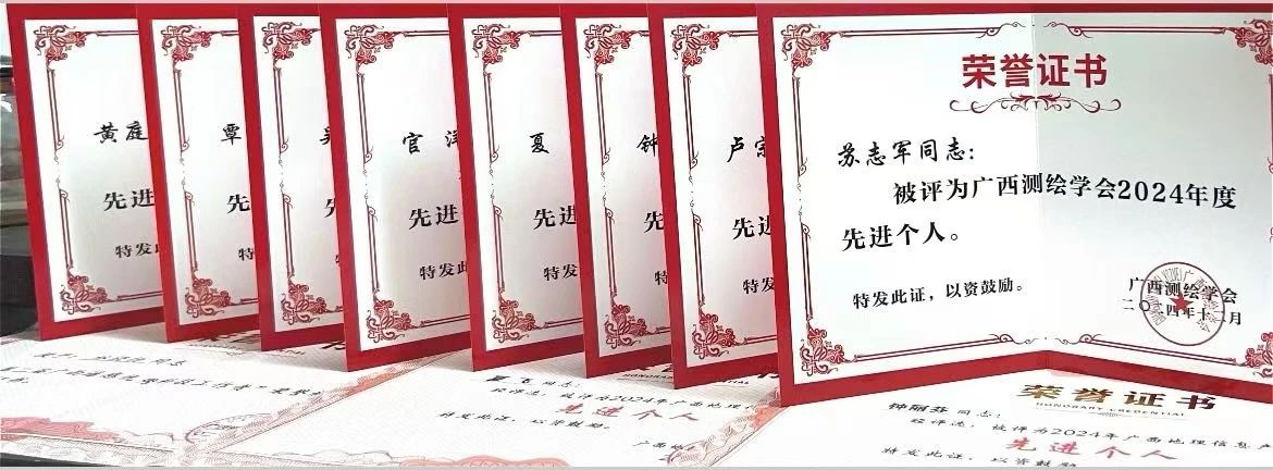 此外,苏志军、卢宗寿等17人次分别荣获2024广西地理信息产业协会先进个人、广西测绘学会2024年度先进个人、第二届广西遥感优秀科技工作者、广西遥感十佳大年优秀科技工作者等荣誉称号。