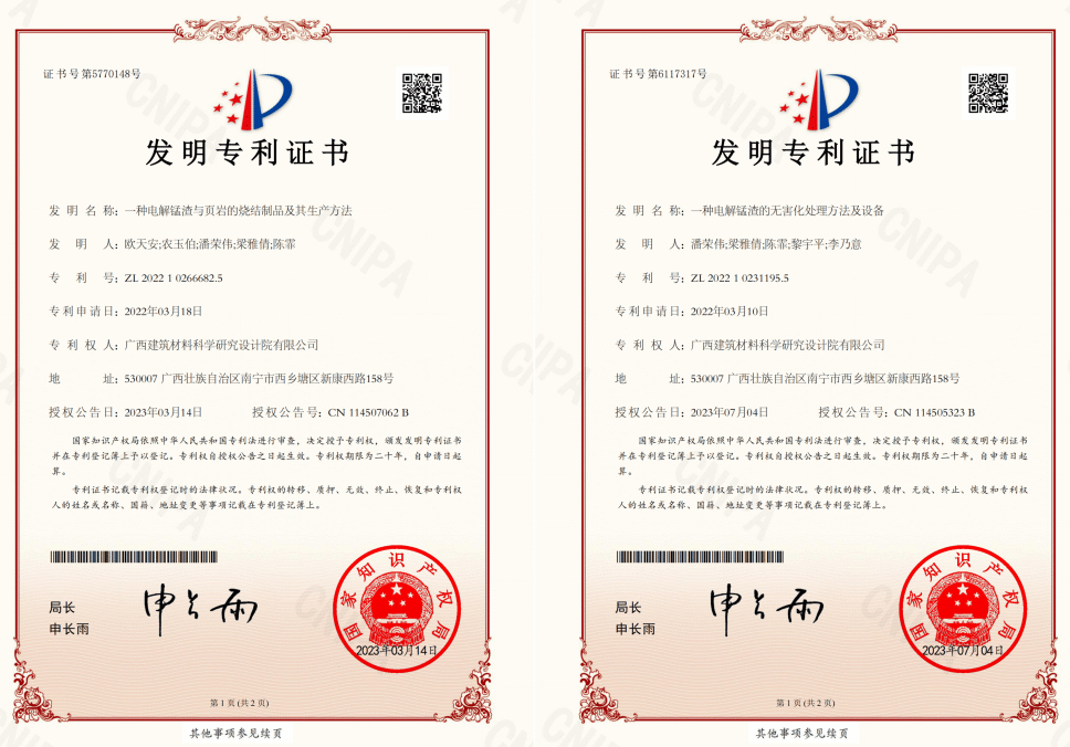 广西建材科研设计院在电解锰渣资源化利用方面取得关键技术突破,其中《一种电解锰渣的无害化处理方法及设备》和《一种电解锰渣与页岩的烧结制品及其生产方法》两项技术获得发明专利授权,对推进区内锰污染治理及锰产业高质量发展具有重要作用,为锰渣资源综合利用技术的推广应用和成果产业化奠定了坚实基础。
