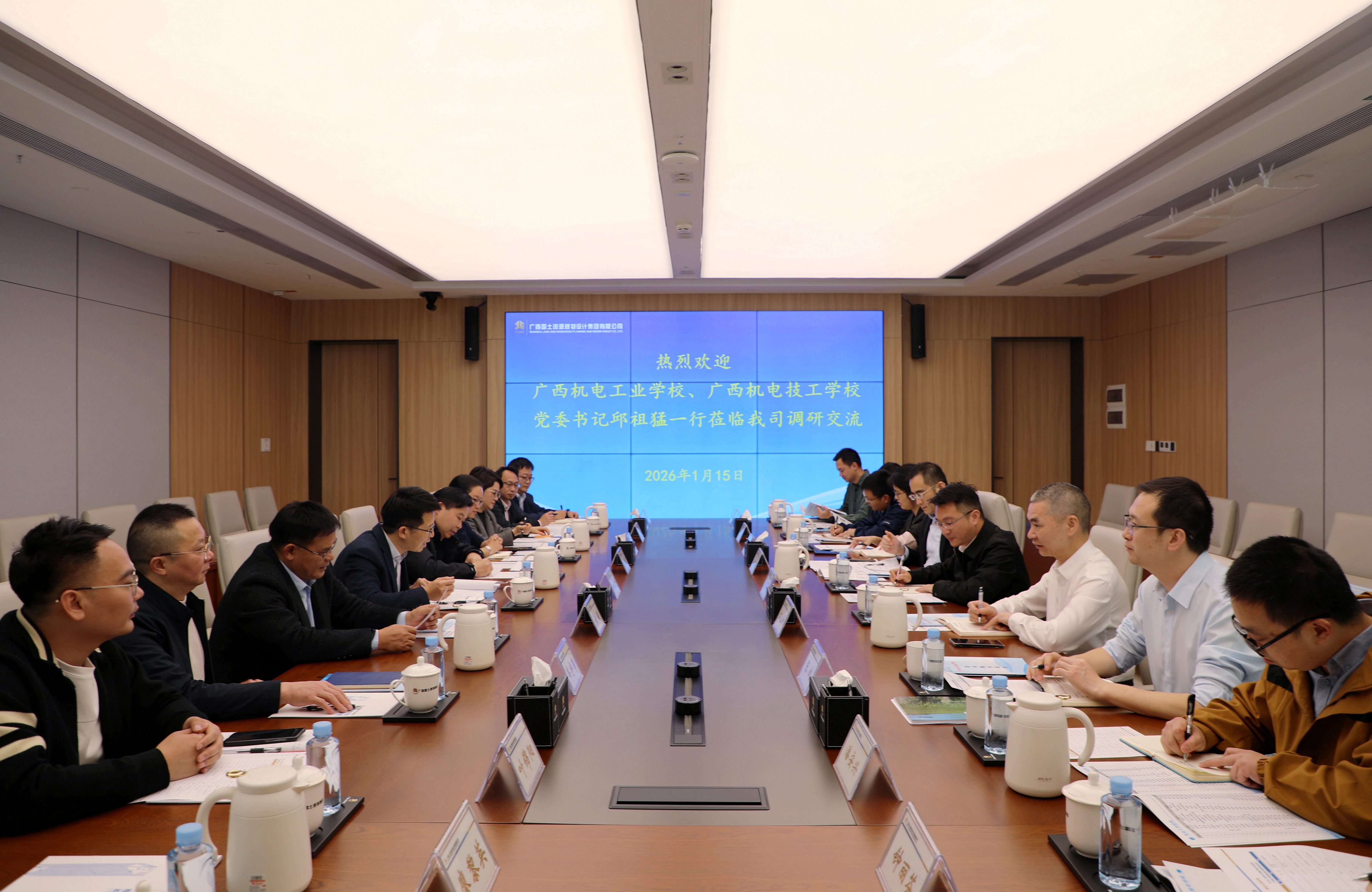 1月15日,广西机电工业学校(广西机电技工学校)党委书记邱祖猛一行到广西国土规划集团座谈交流。广西机电工业学校(广西机电技工学校)党委副书记、校长林秀朋,广西国土规划集团党委副书记、副董事长、总经理梁亮参加会议。