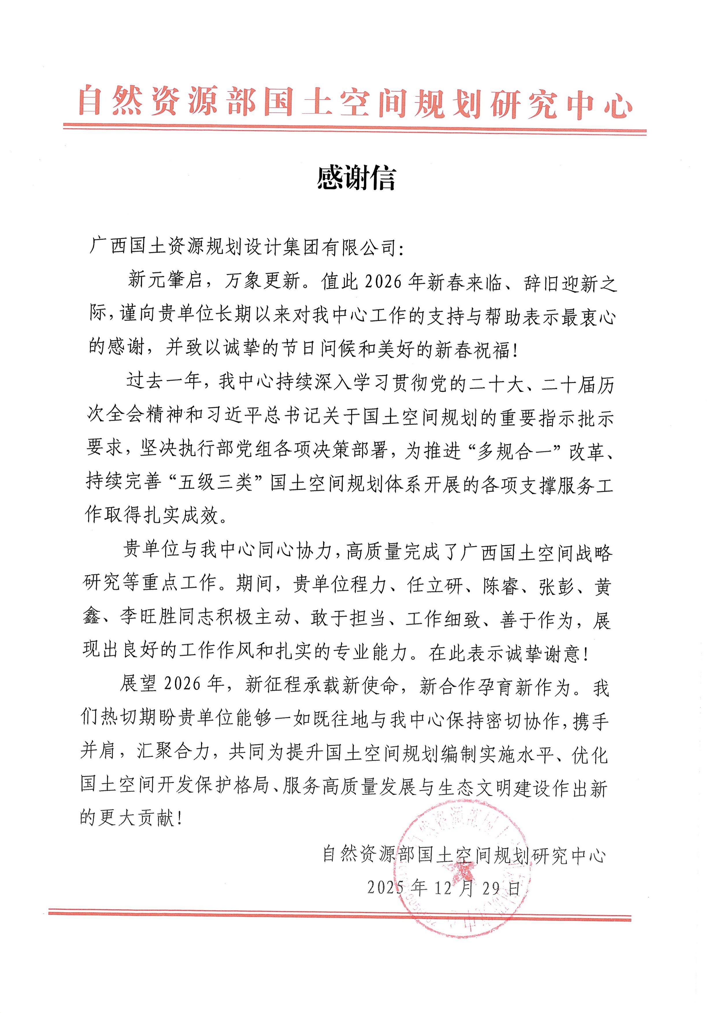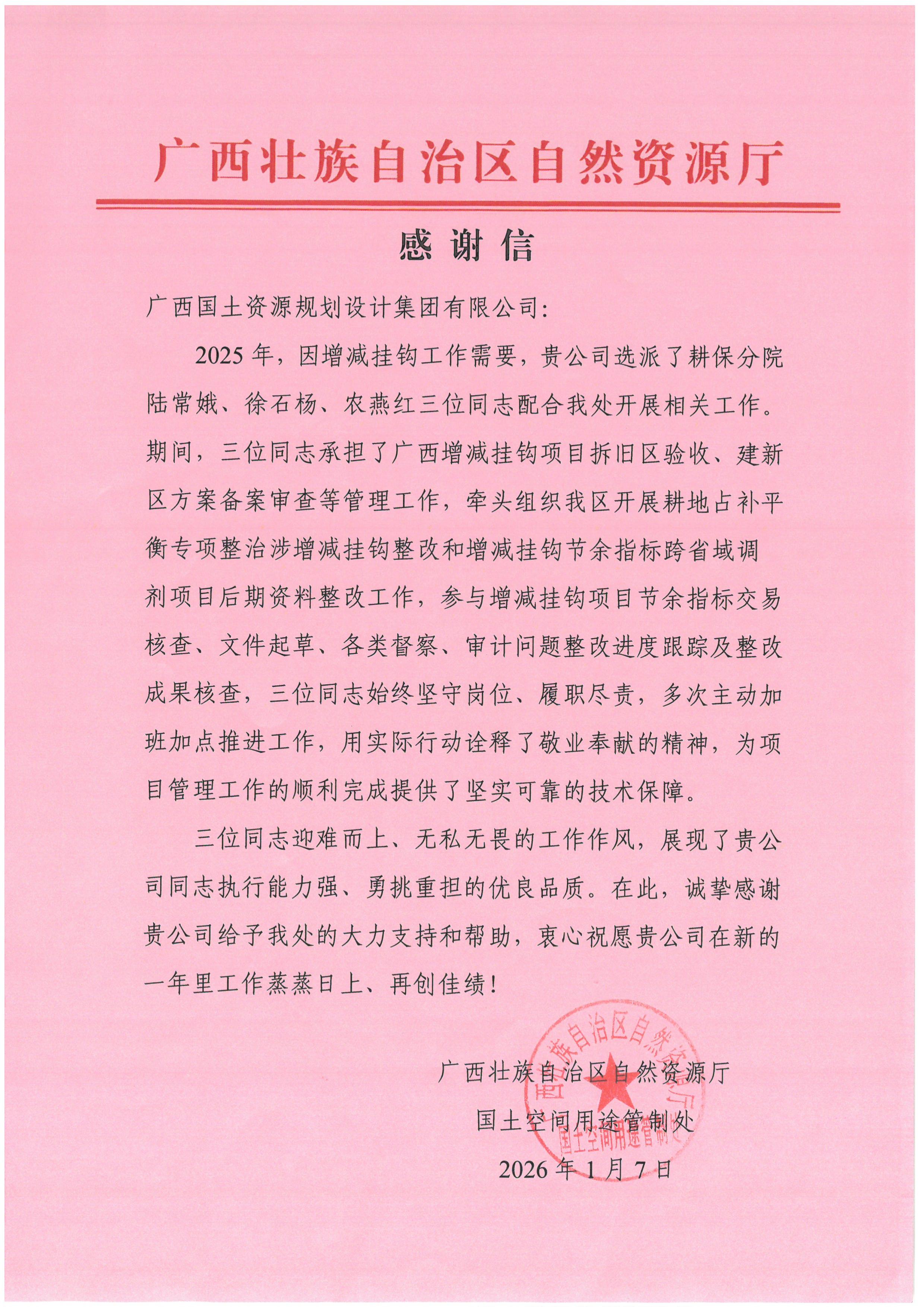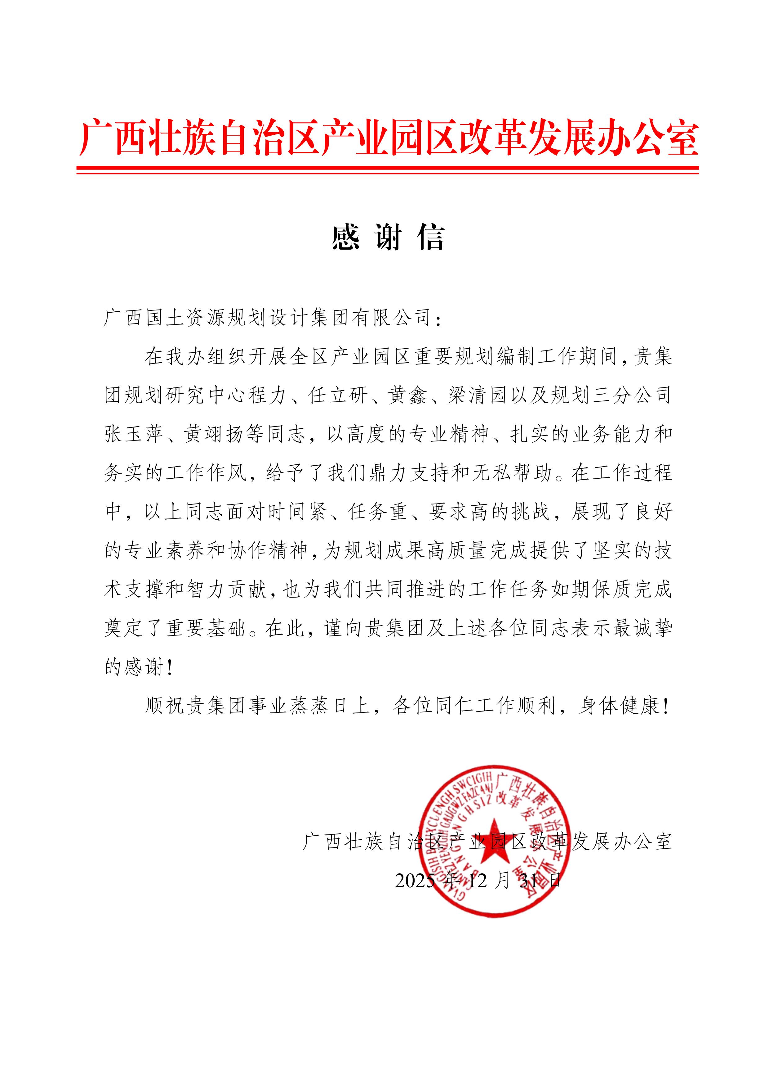 信中,各单位对广西国土规划集团过去一年的工作给予了高度认可,特别是在国土空间规划、产业园区规划、高标准农田建设、用地报批、增减挂钩、土地复垦及重大课题研究等重点项目中,所展现的专业能力、服务品质与取得的扎实成效予以充分肯定。