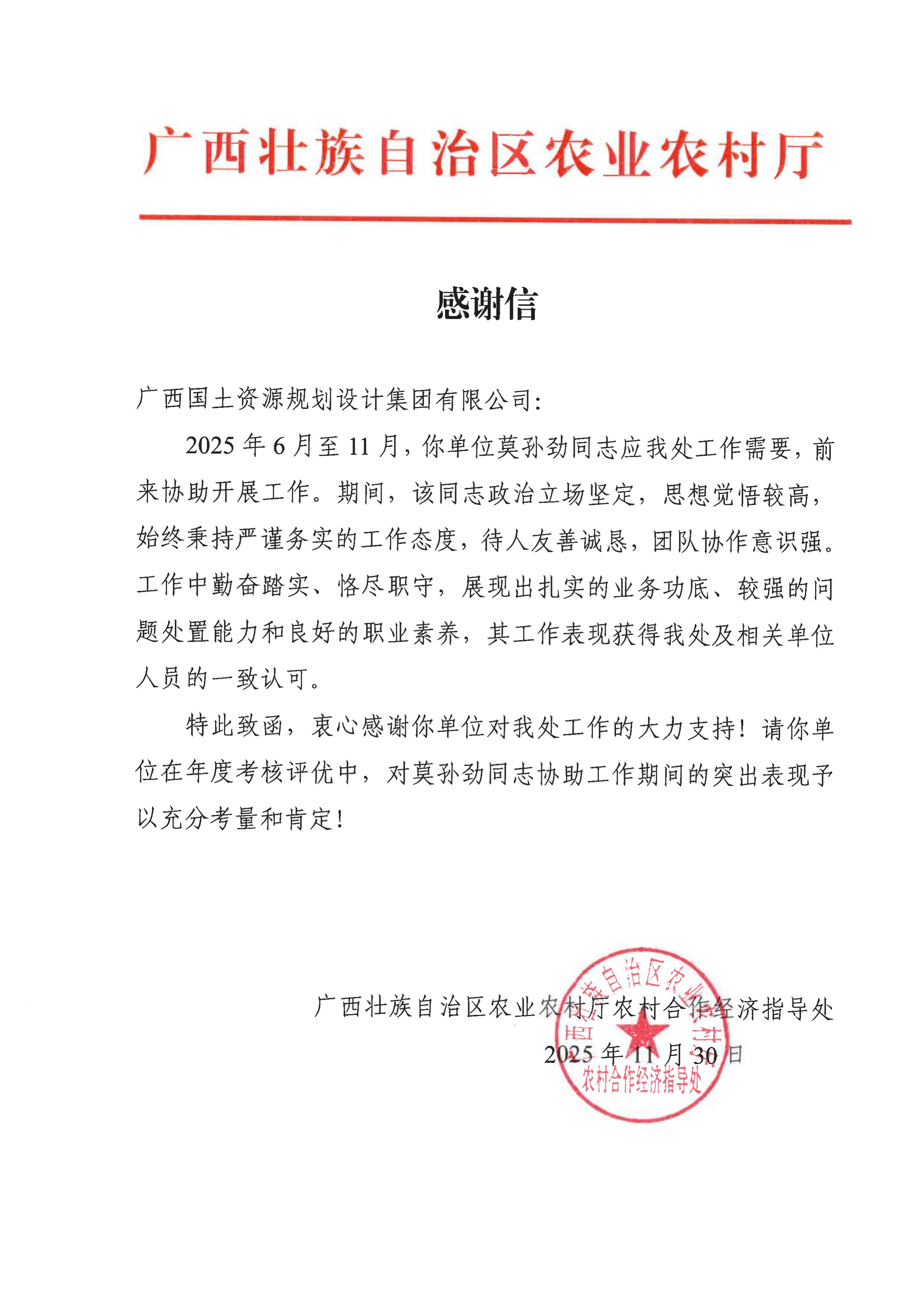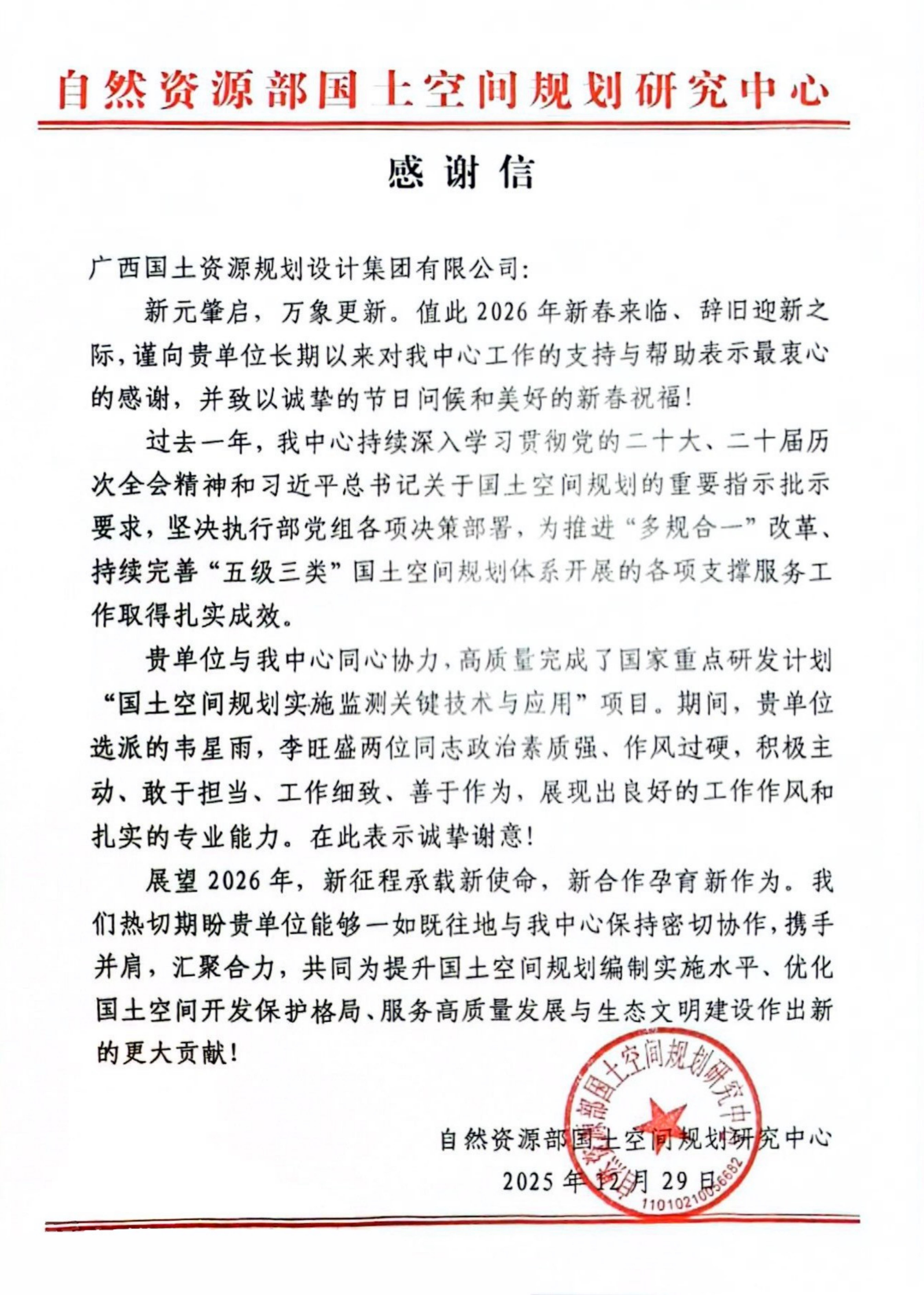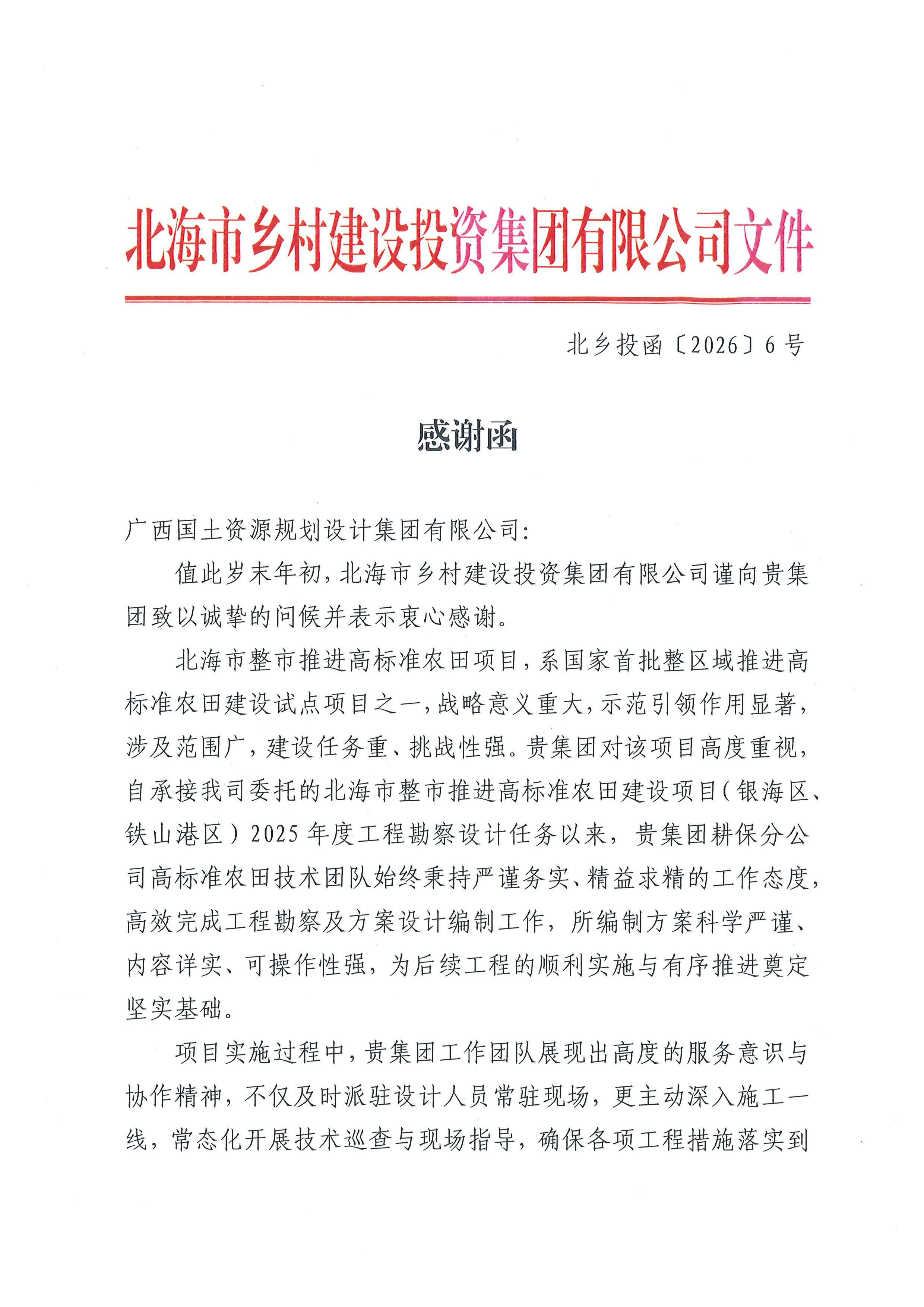 信中,各单位对广西国土规划集团过去一年的工作给予了高度认可,特别是在国土空间规划、产业园区规划、高标准农田建设、用地报批、增减挂钩、土地复垦及重大课题研究等重点项目中,所展现的专业能力、服务品质与取得的扎实成效予以充分肯定。