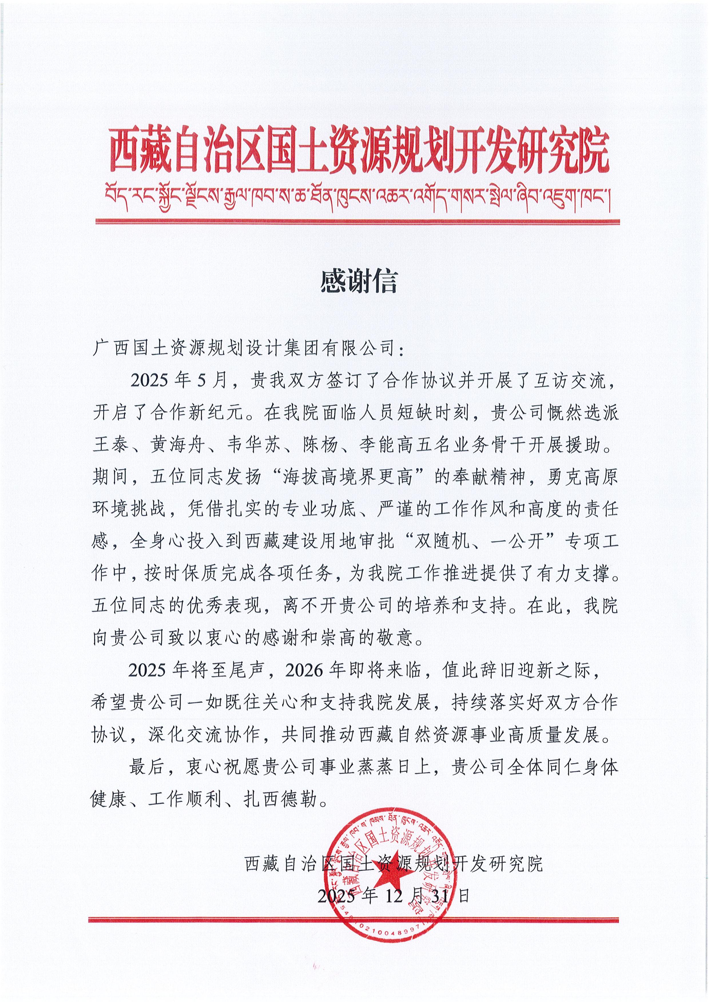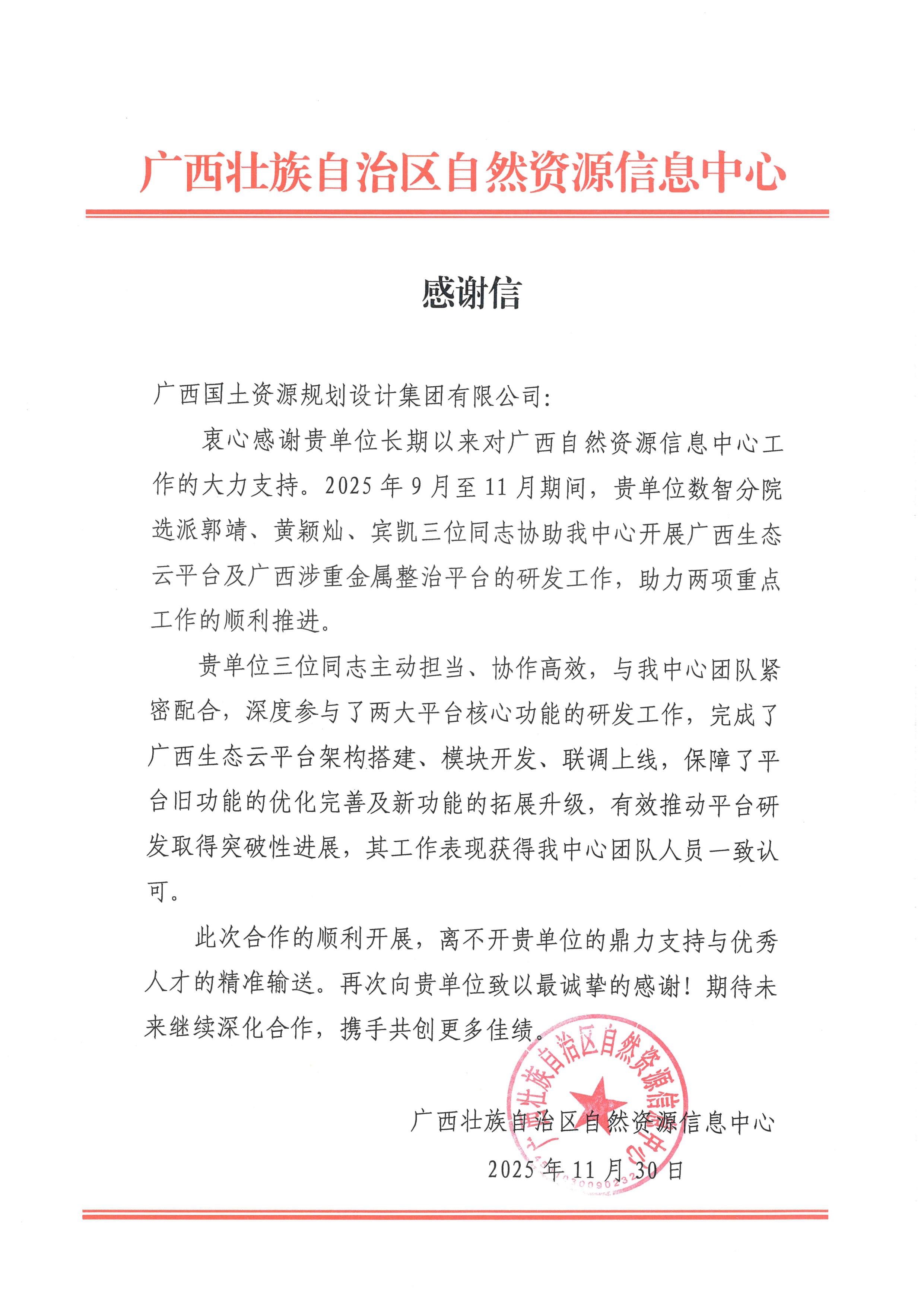 近日,广西国土规划集团相继收到自然资源部国土空间规划研究中心、西藏自治区国土资源规划开发研究院、自治区自然资源厅、自治区产业园区改革发展办公室等多家单位发来的感谢信。
